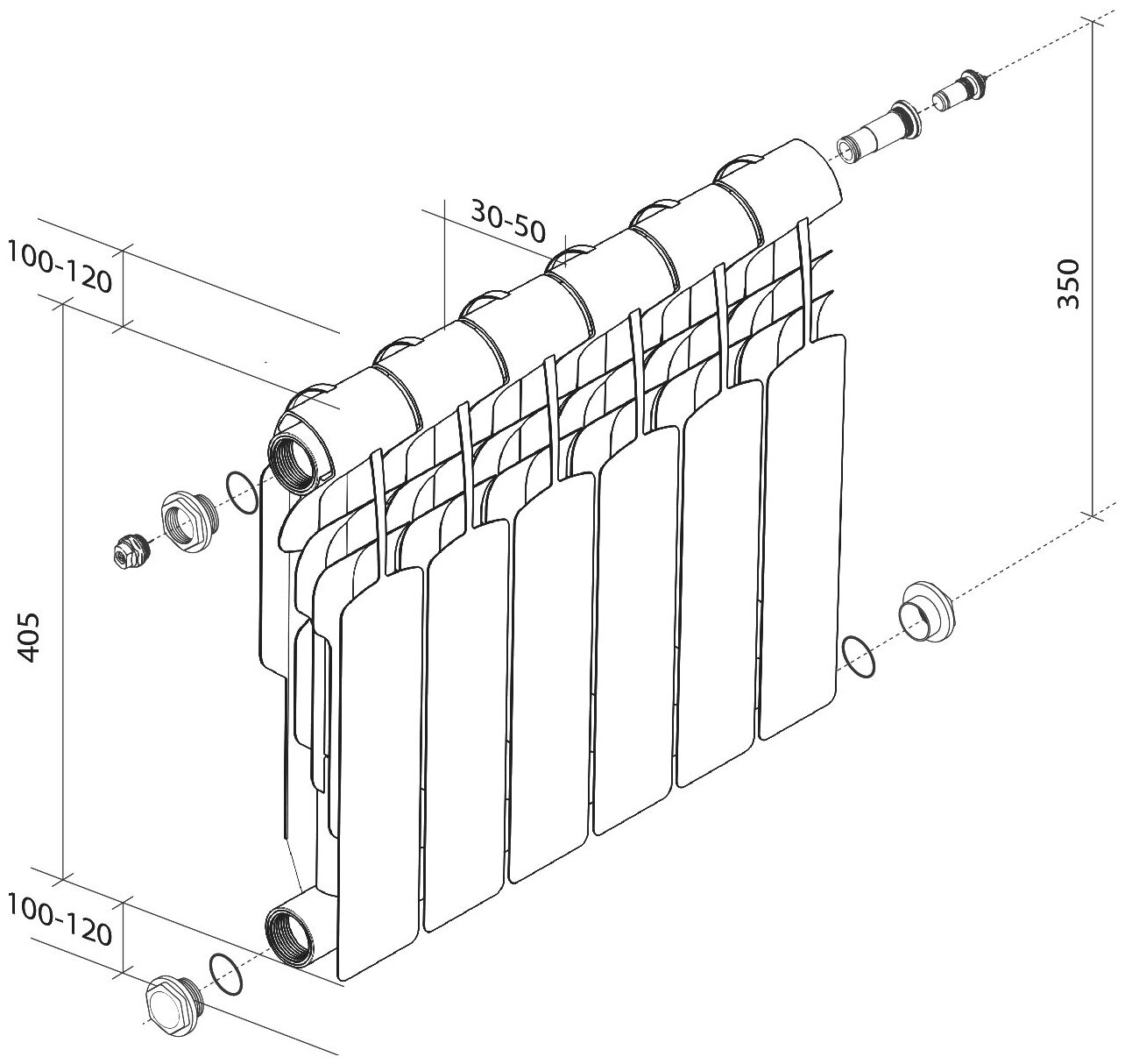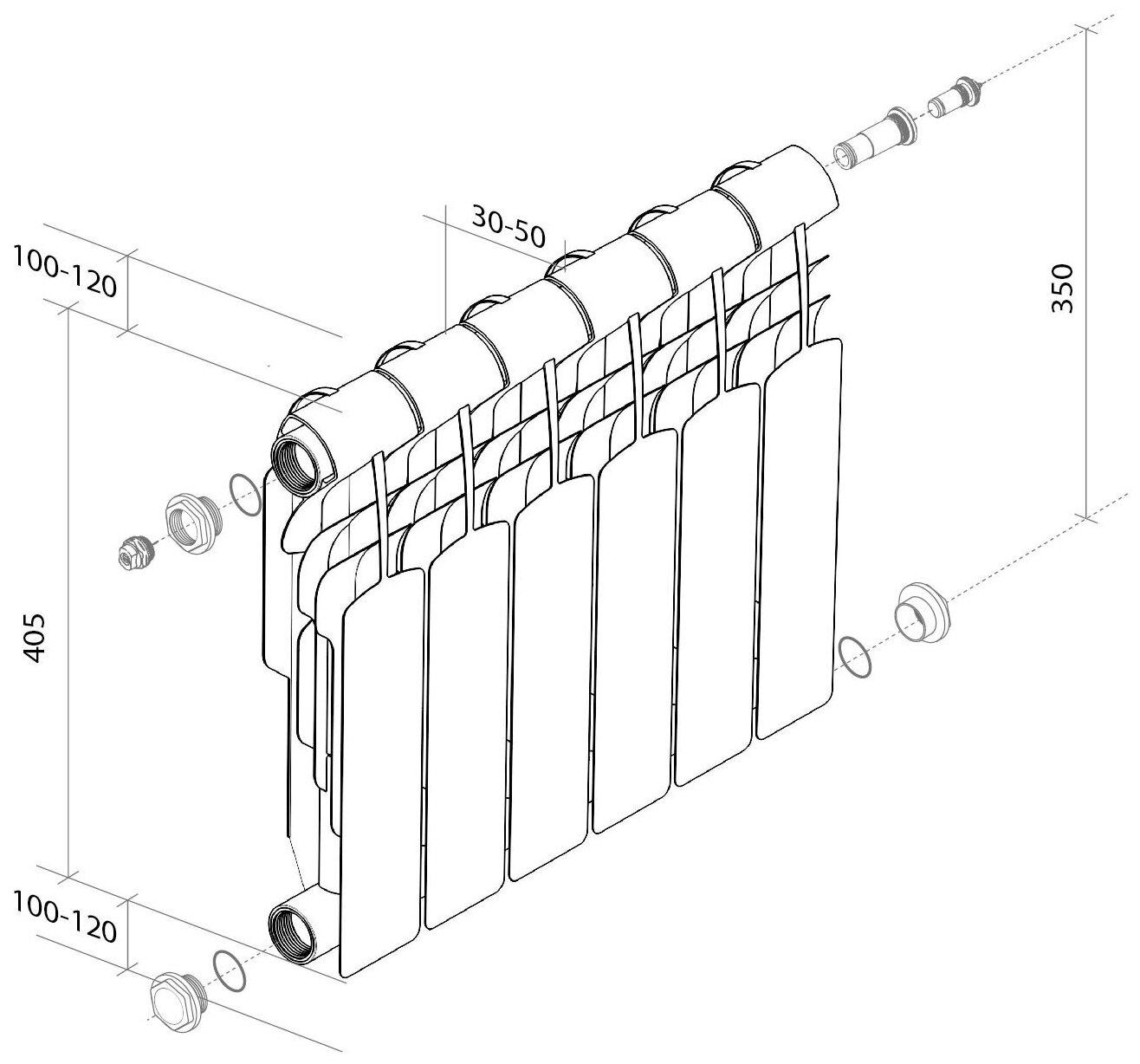 Material: bimetal, construction: wall-mounted, spacing: 350 mm, thickness: 80 mm, type: sectional, mounting kit