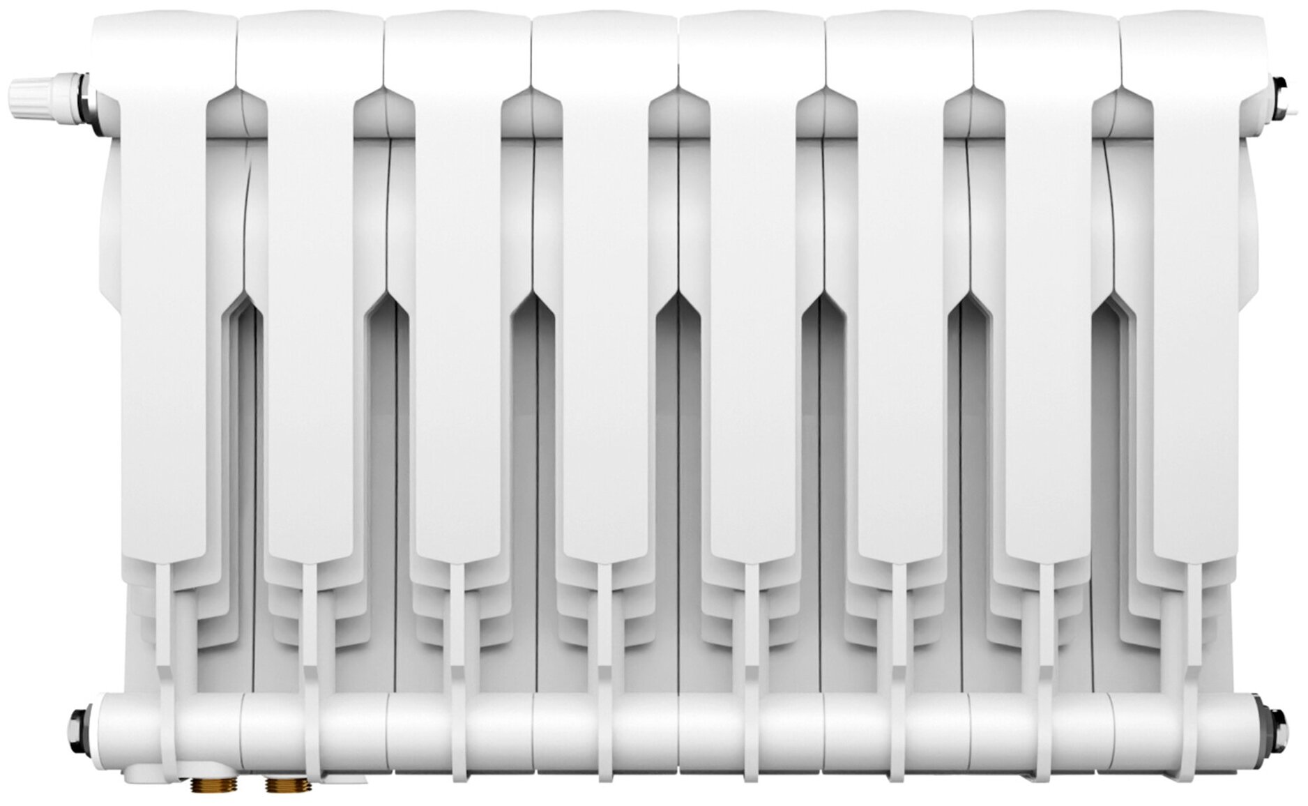 The radiator is supplied in shrink film and branded packaging with installed parts: Danfoss valve insert, flow guide, nut with gasket + Mayevsky tap, plug nut right and left, adapters for