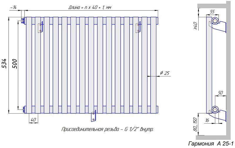 Material: steel, construction: wall-mounted, spacing: 500 mm, thickness: 55 mm, type: tubular