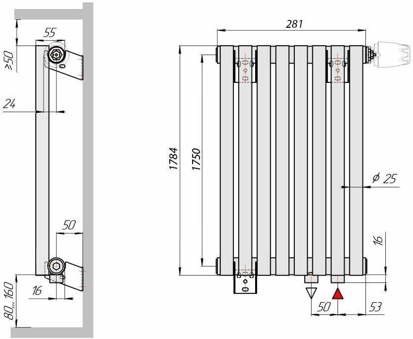 Material: steel, construction: wall-mounted, spacing: 1750 mm, thickness: 80 mm, type: tubular
