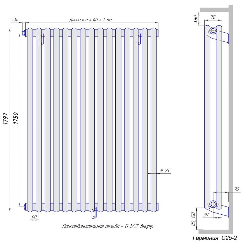 Material: steel, construction: wall-mounted, center distance: 1750 mm, thickness: 78 mm, type: tubular