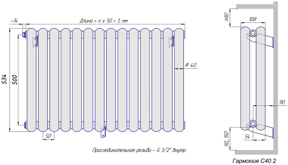 Material: steel, construction: wall-mounted, spacing: 500 mm, thickness: 108 mm, type: tubular