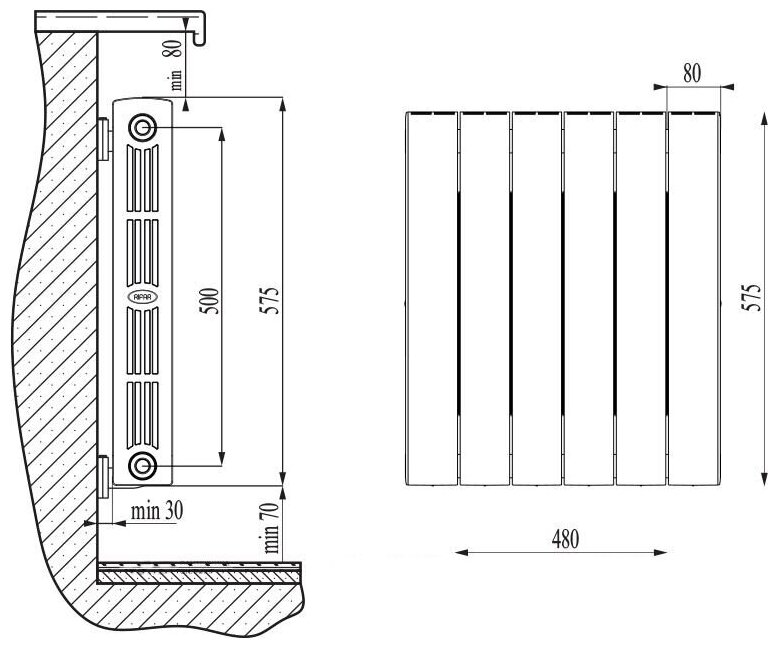 Material: bimetal, construction: wall-mounted, spacing: 500 mm, thickness: 90 mm, type: sectional