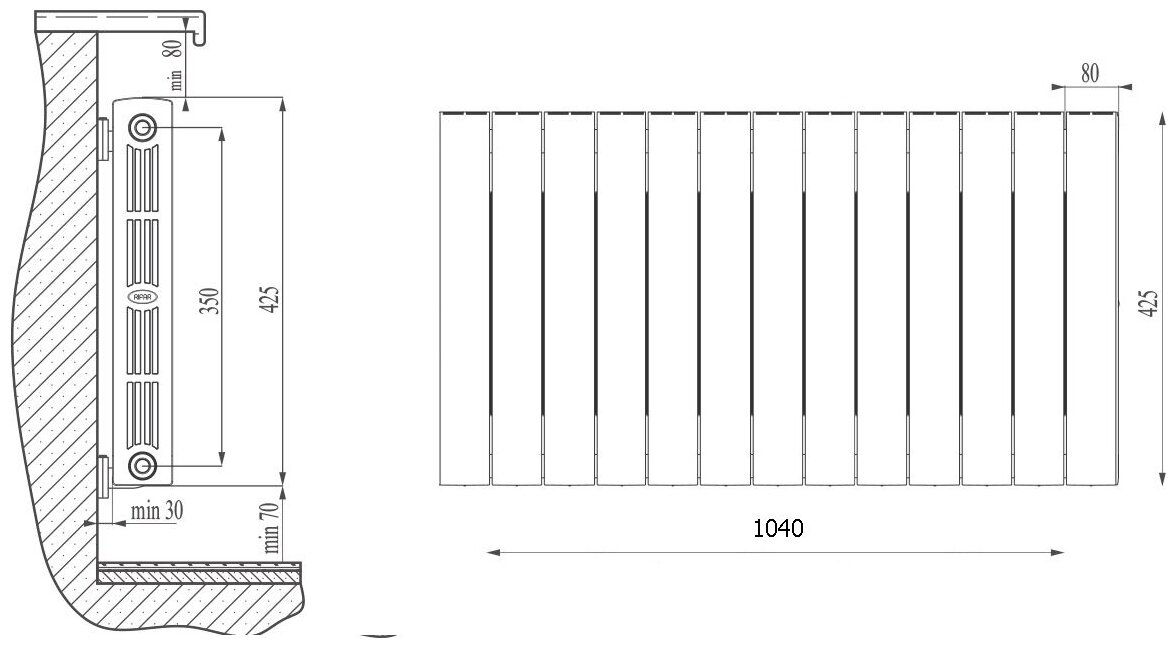 Description: Material: bimetal, construction: wall-mounted, spacing: 50 mm, thickness: 90 mm, type: monolithic