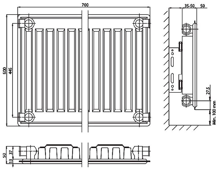 Material: steel, construction: wall-mounted, spacing: 446 mm, thickness: 63 mm, type: panel, mounting kit