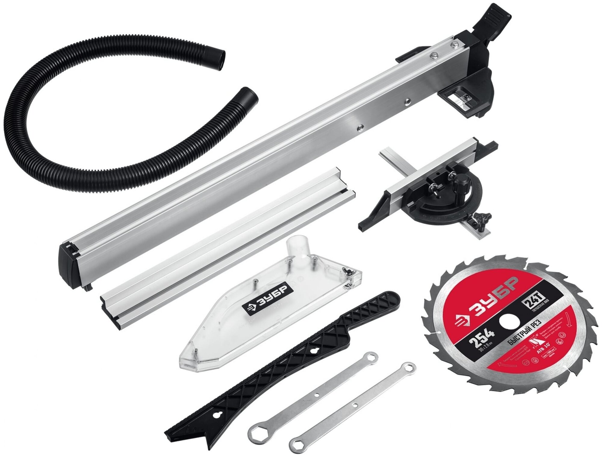 Sawing machine - 1 pc., saw blade Ø 254 mm, bore diameter - 30 mm, number of teeth - 24 - 1 pc., protective casing - 1 pc., longitudinal guide assembly - 1 pc., angle stop - 1 pcs., wrench - 2 pcs., feed pusher