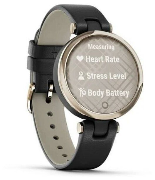 Garmin Lily smart watch, cream gold bezel, black case and Italian leather