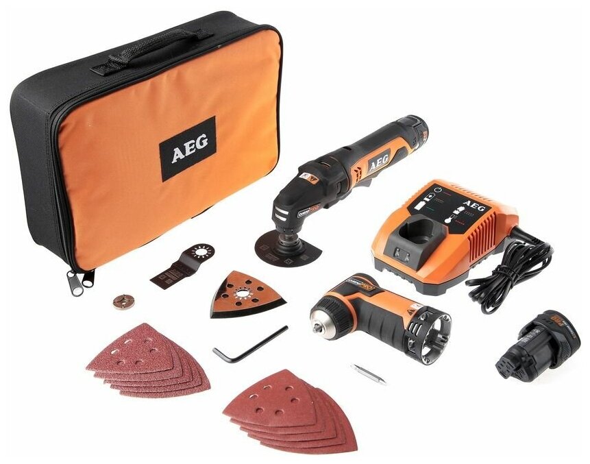 Two batteries, charger, multifunctional attachment, drilling attachment, a set of files and sanding sheets, a bag