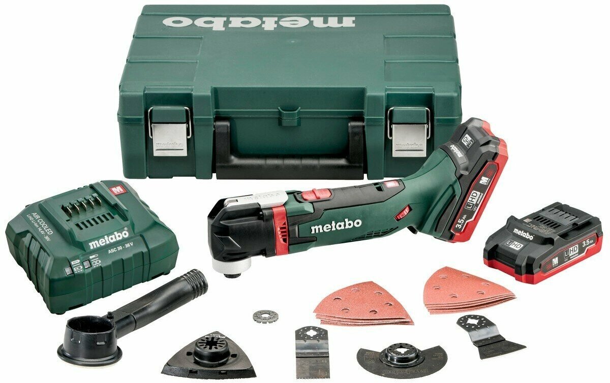 Plunge saw blade 32 mm HCS wood, triangular sanding sheet 93 mm with Velcro, 5 sanding sheets with Velcro 93 mm P 80, 5 sanding sheets with Velcro 93 mm P 120, dust extractor adapter, multiad