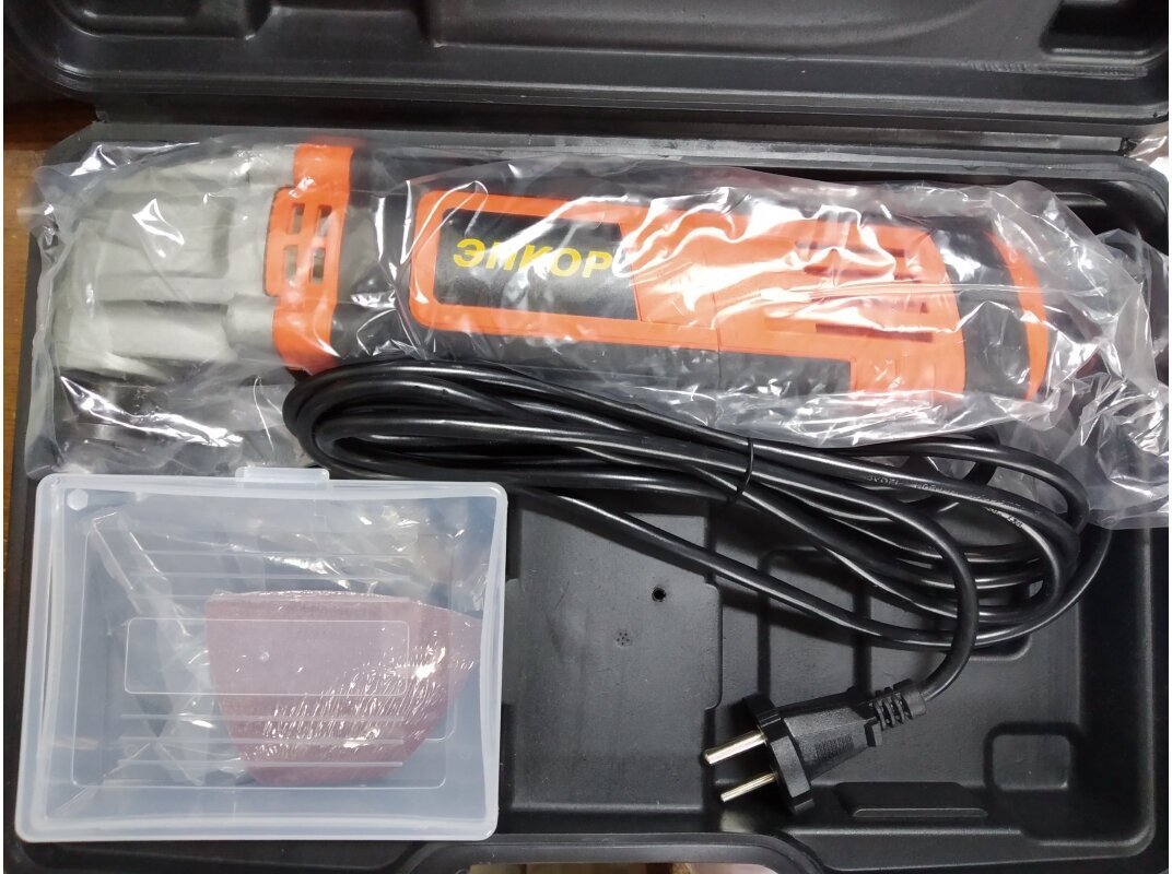 Machine 1 pc., outer flange 1 pc., screw 1 pc., saw head 1 pc., flat scraper 1 pc., platform for sanding sheets 1 pc., sanding sheet 2 pcs., hex key 1 pc., hex key 1 pc., manual operation 1 copy, case 1 pc