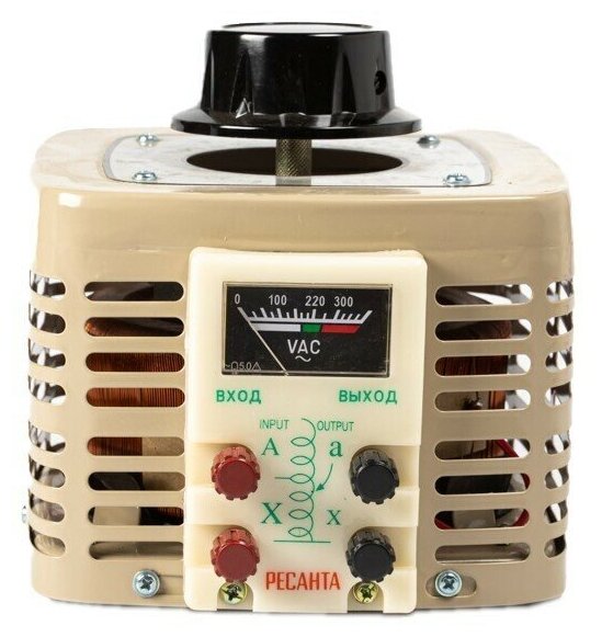 Input voltage: 220 V 1-phase, output voltage: 0-250 V, power: 1000 VA, maximum output current: 4 A, degree of protection: IP20, built-in voltmeter