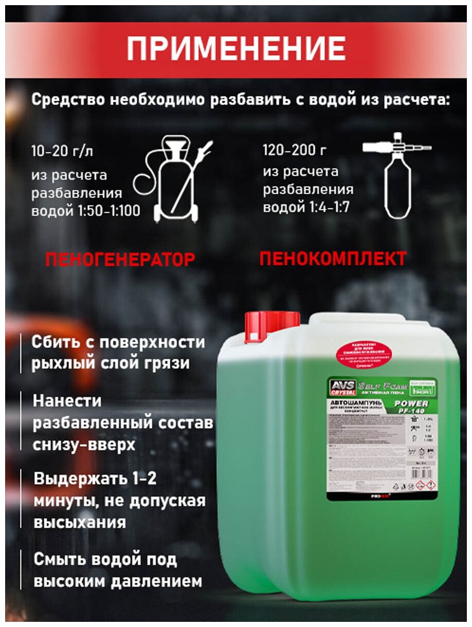For self-service car washes: depending on the dosing system, set the concentration of the finished solution to 1-3%. For traditional sinks: before application, the product must be diluted with water: Foam kit 120-2