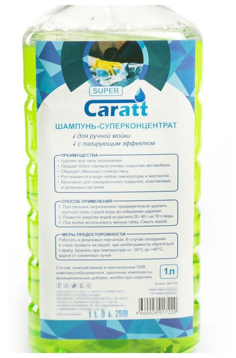 coarse dirt with a jet of water to avoid scratches; dilute the product with water at the rate of 20-40 g per 10 liters of water; when washing, use a soft sponge; wash off with water