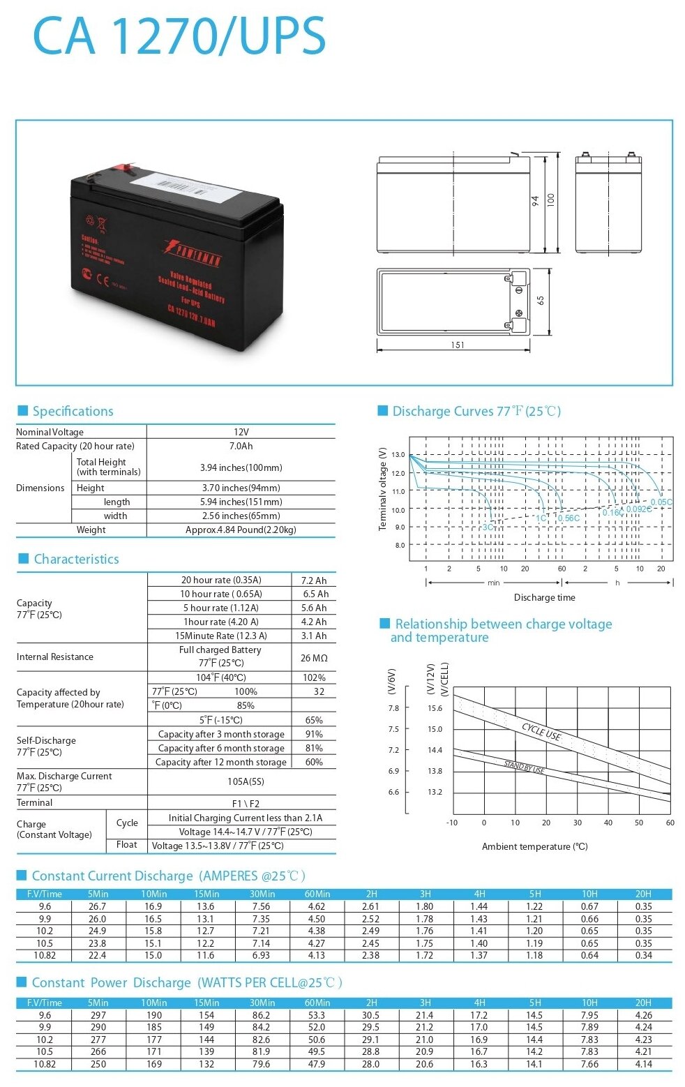 Model/version: lead dry element, AGM, nominal. voltage: 12 V, battery capacity: 7 Ah, length: 151 mm, height: 94 mm, width: 65 mm, height including terminal pole: 100 mm, special features: indoor installation