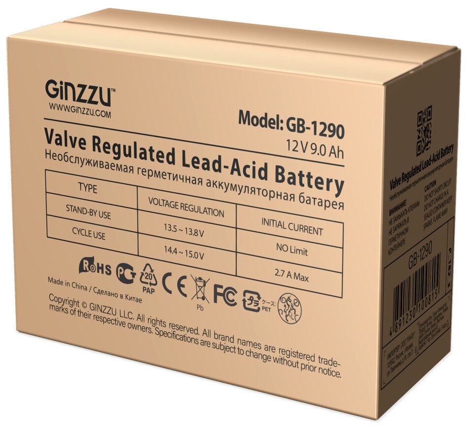 Sealed, maintenance-free; internal resistance 18 mΩ, terminal type - clamp 5mm/7mm; maximum discharge current 135A, charge - 2.7A; battery can be stored for 6 months without recharging at 25°C
