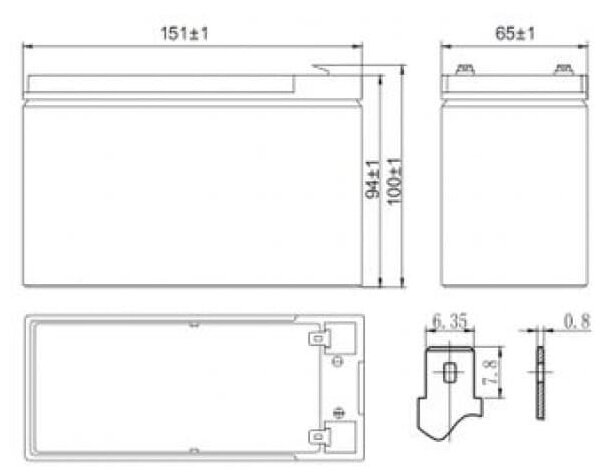 Model/version: lead dry element, AGM, nominal. voltage: 12 V, battery capacity: 7 Ah, length: 151 mm, height: 94 mm, width: 65 mm, height including terminal pole: 100 mm