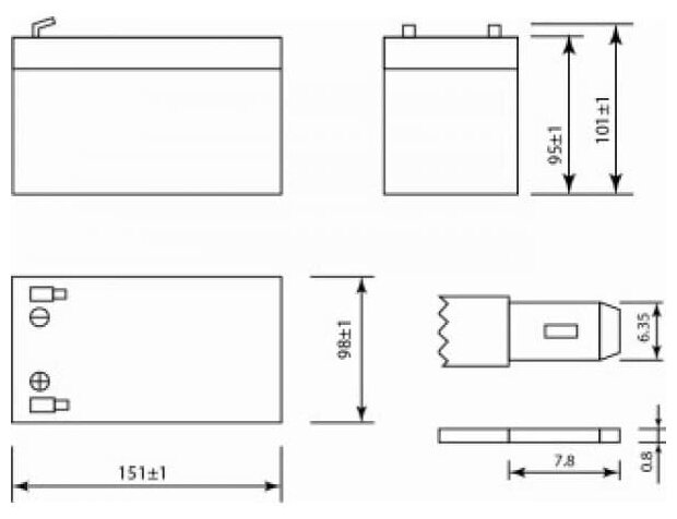 Description: Model/version: lead dry element, AGM, nominal. voltage: 12 V, battery capacity: 12 Ah, length: 151 mm, height: 95 mm, width: 98 mm, depth: 98 mm, height including terminal pole: 93 mm, features: suitable for