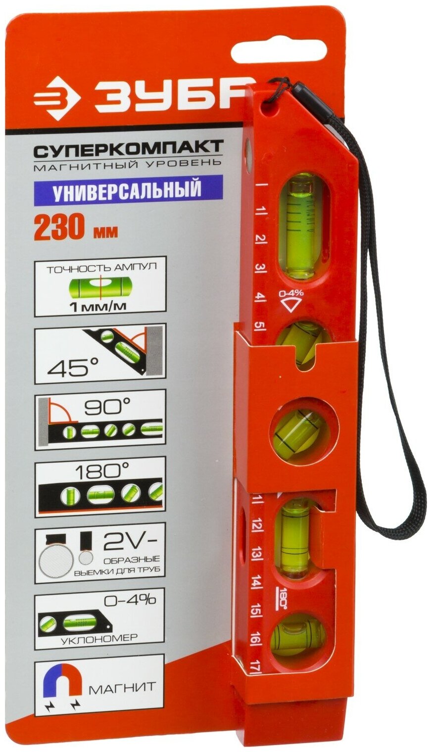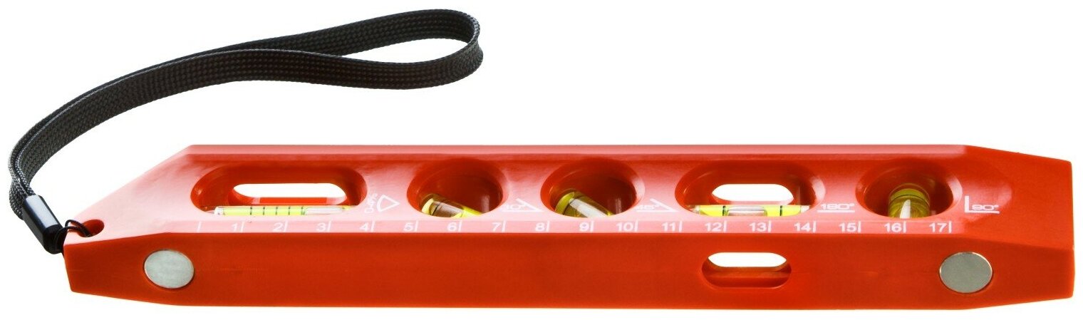 5 shockproof ampoules: horizontal, vertical, 45°, 30°, inclinometer 0–4%; 2 V-grooves for pipes of various diameters