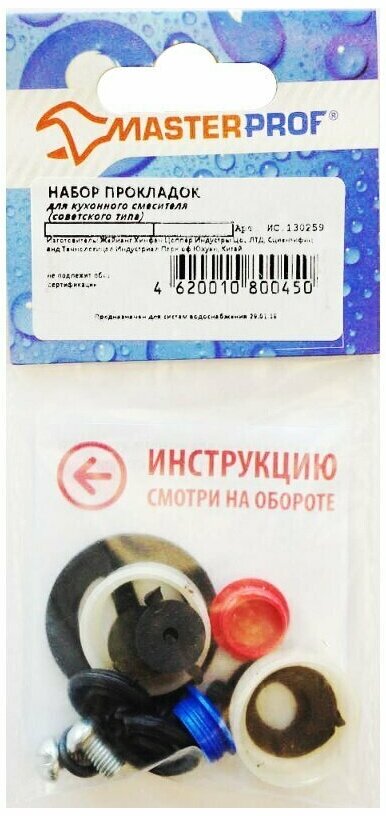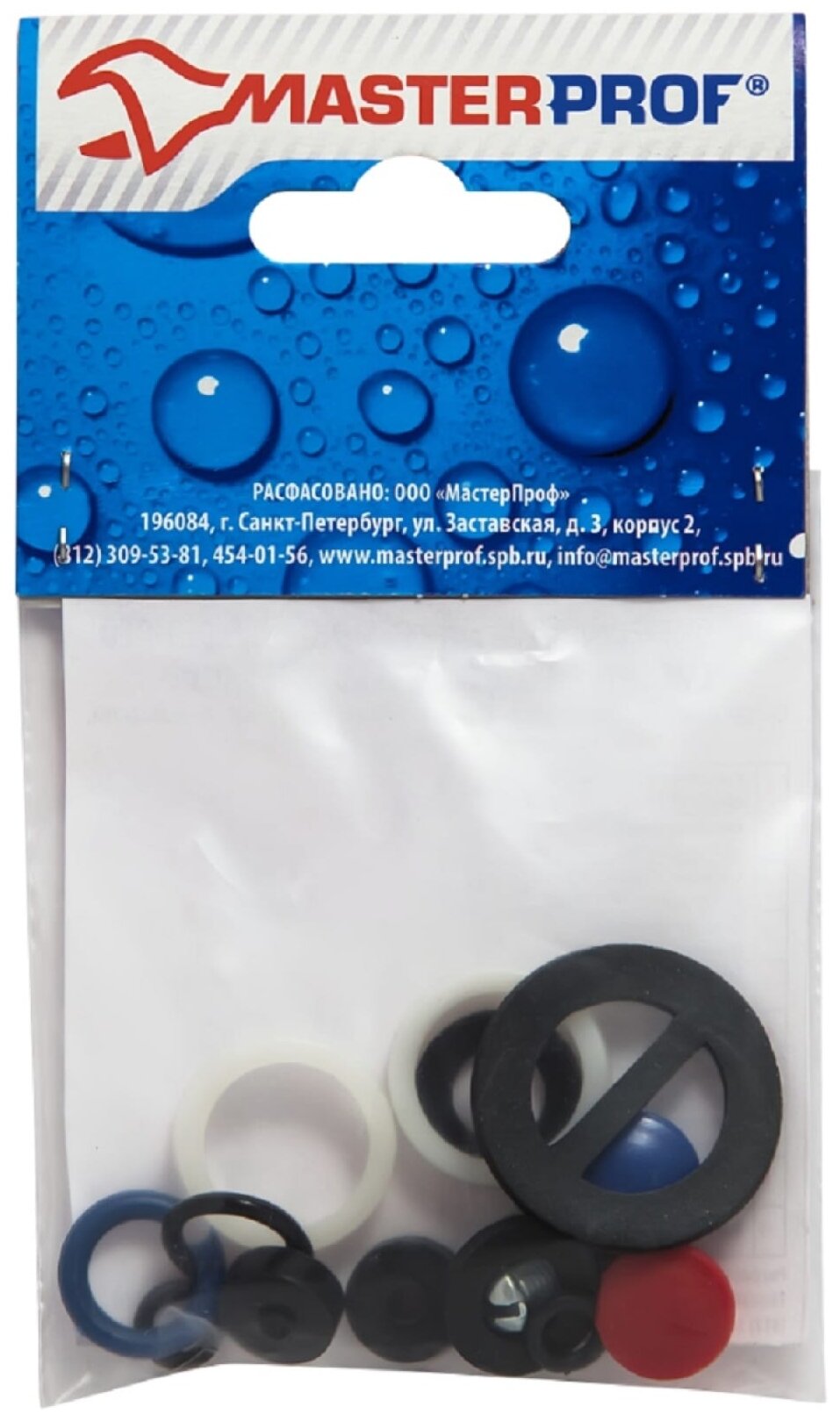 Equipment: Ring for domestic spout 12 x 16 1 pc., rubber ring for faucet box 6 x 10 4 pcs., tablet for faucet box 13 mm 2 pcs., stop ring for domestic spout 12 - 16 mm 1 pc., rubber gasket for water 1/ 2" 1 sh
