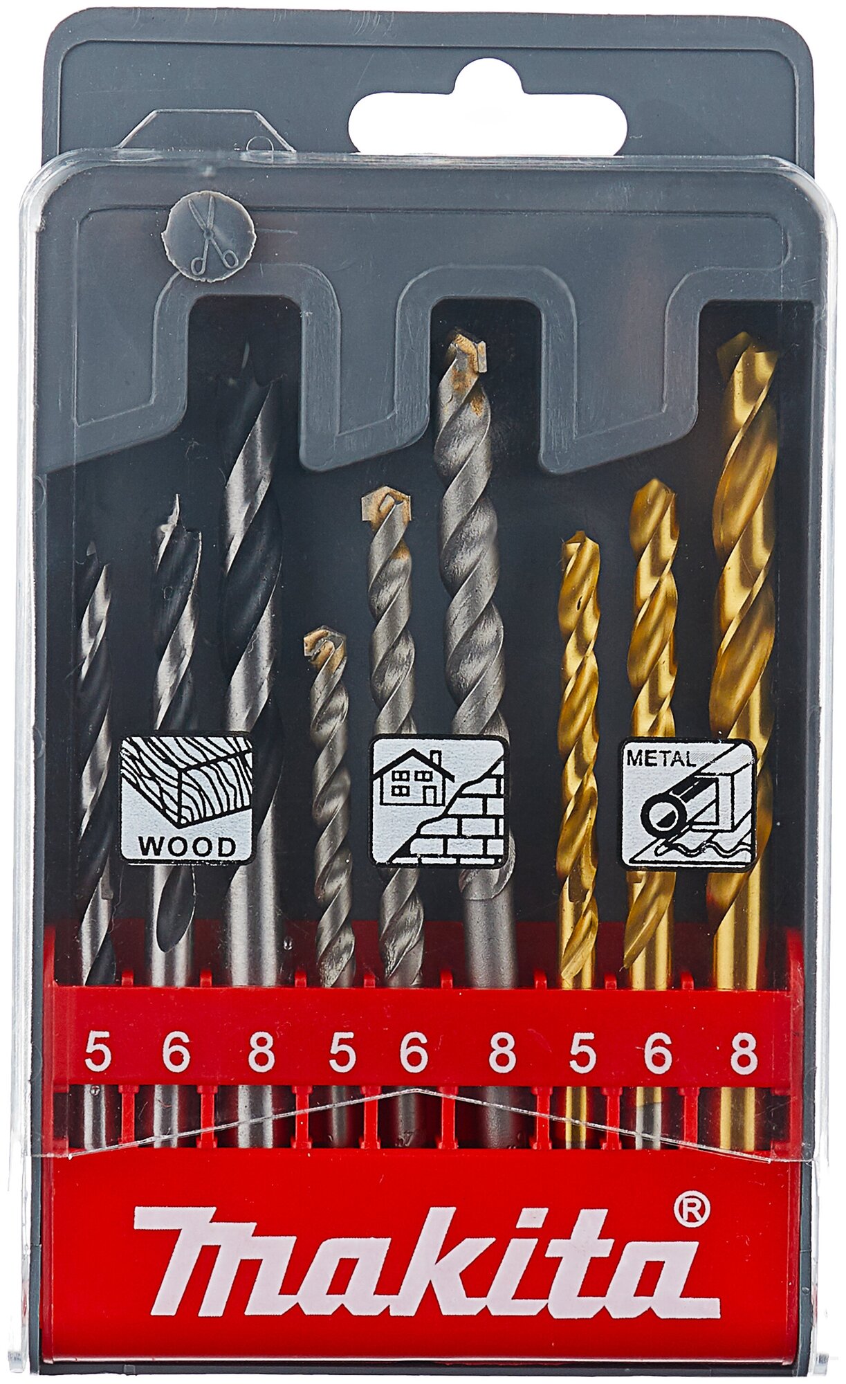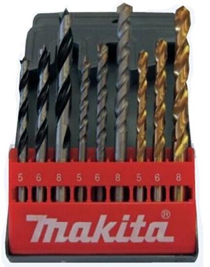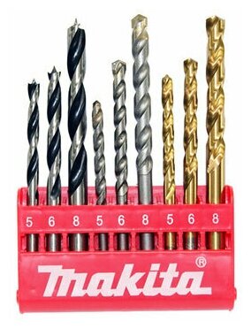 Standard sizes: for metal 5x6x8 mm; on concrete 5x6x8 mm; for wood 5x6x8 mm, shank type: cylindrical, quantity per set per pack: 9 pcs, for concrete, for wood, for metal