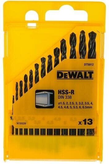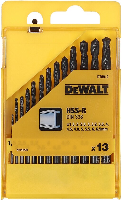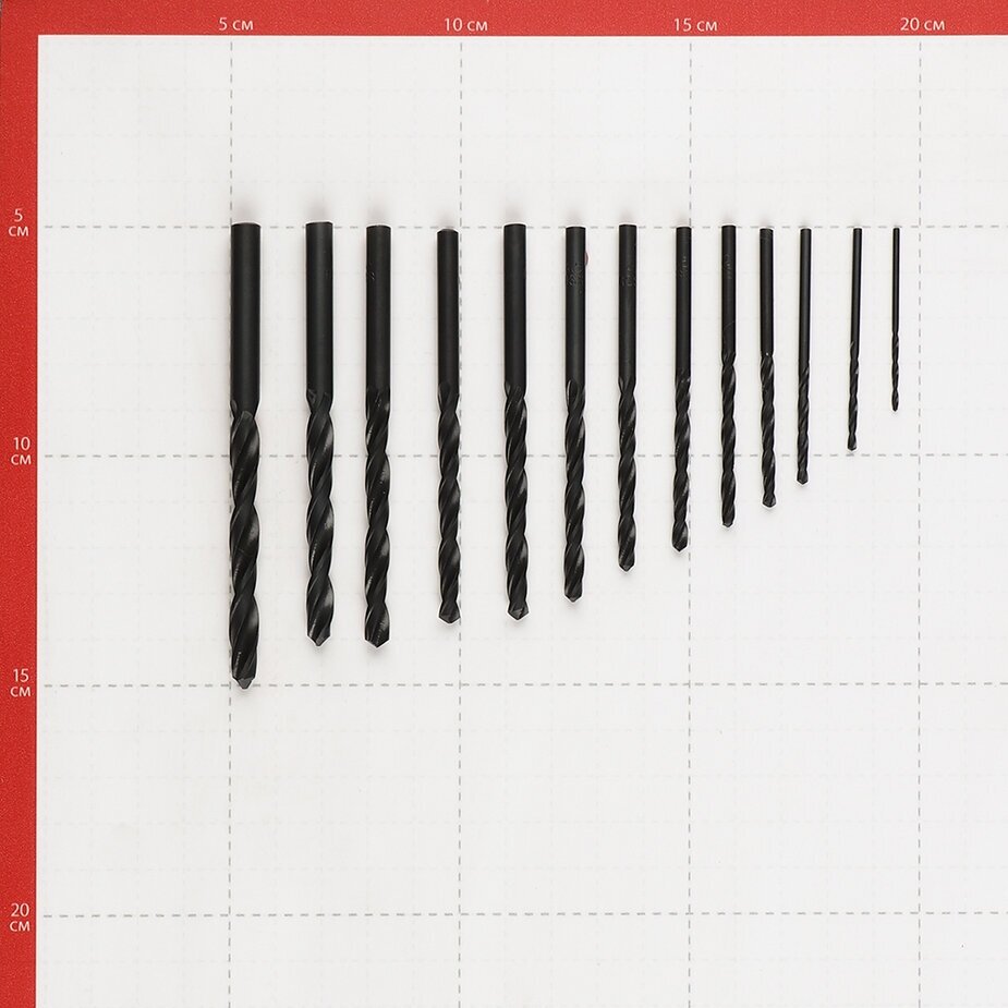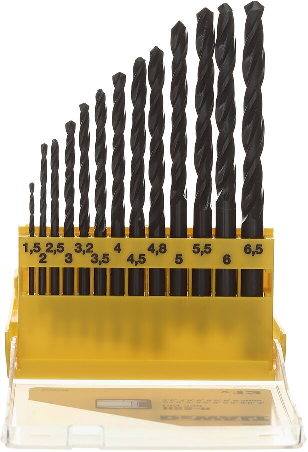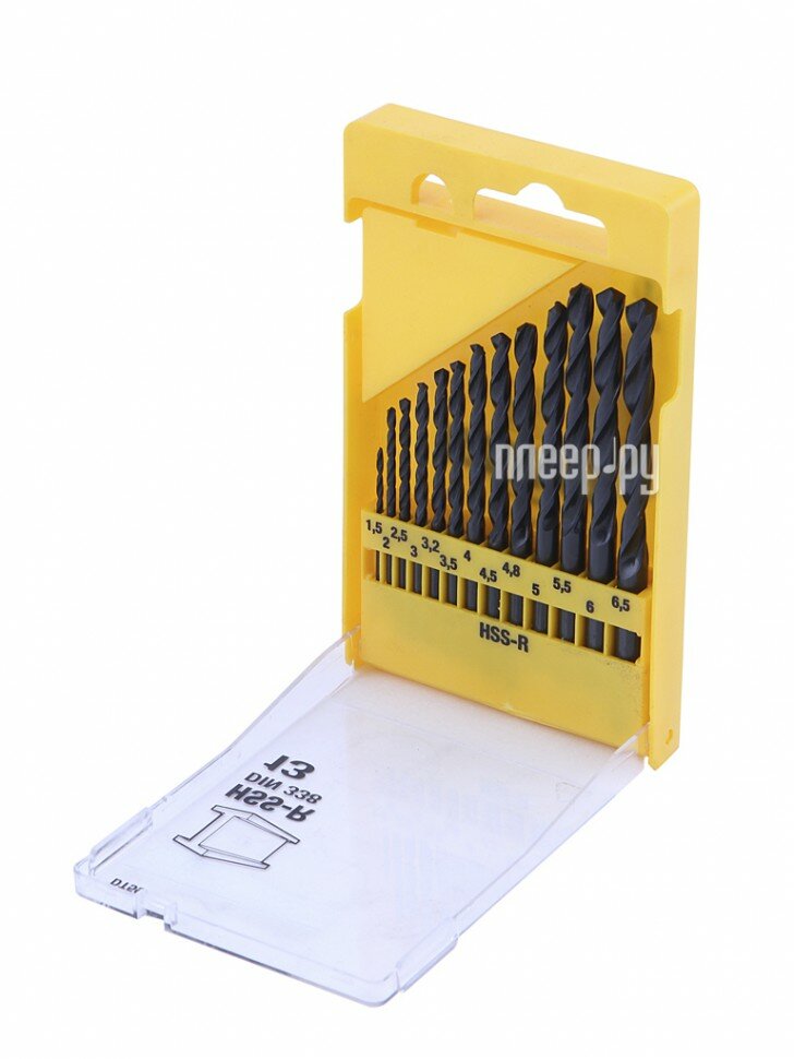 Standard sizes: for metal 1.5, 2, 2.5, 3, 3.2, 3.5, 4, 4.5, 4.8, 5, 5.5, 6, 6.5 mm, shank type: cylindrical, number in the set package: 13 pcs., drill material: HSS- R, sharpening angle: 118 degrees, for metal