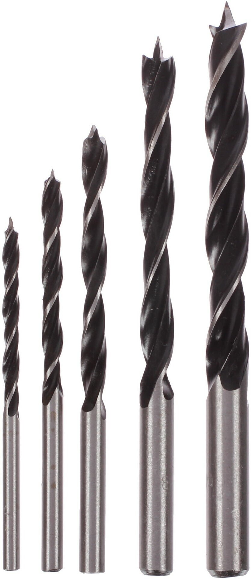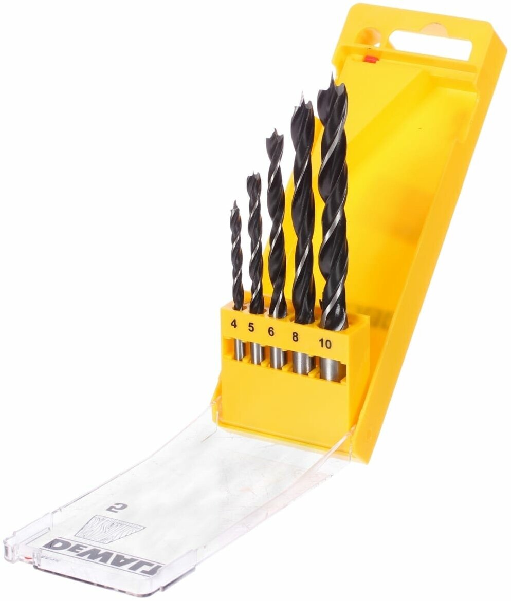 Standard sizes: for wood 4, 5, 6, 8, 10 mm, shank type: cylindrical, quantity in a set package: 5 pcs., for wood