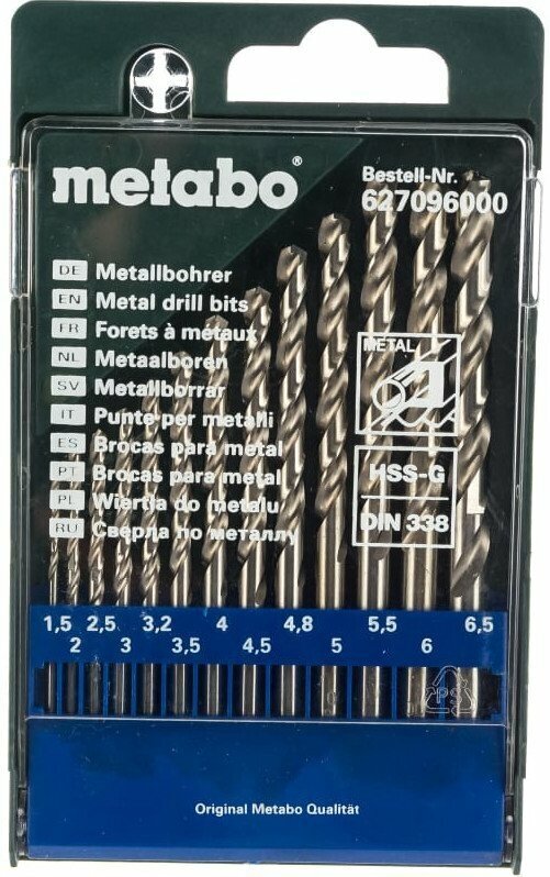 Equipment: set, sizes: for metal 1.5, 2, 2.5, 3, 3.2, 3.5, 4, 4.5, 4.8, 5, 5.5, 6, 6.5 mm, shank type: cylindrical, quantity in the set package: 13 pcs., material drills: HSS-G, sharpening angle: 135 degrees, for metal