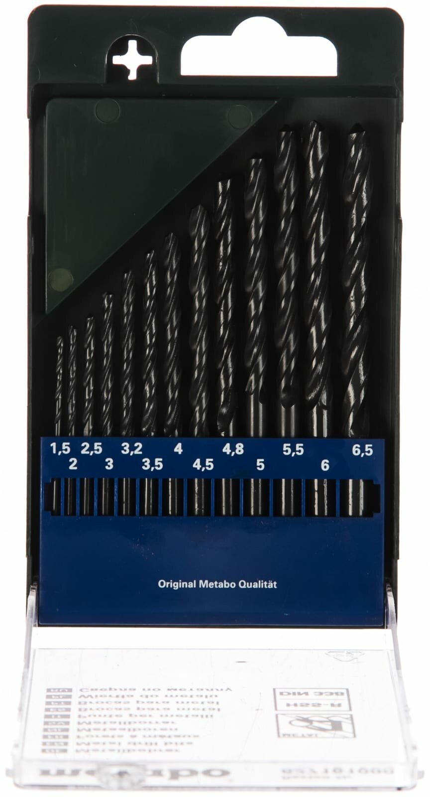 Standard sizes: for metal 1.5, 2, 2.5, 3, 3.2, 3.5, 4, 4.5, 4.8, 5, 5.5, 6, 6.5 mm, shank type: cylindrical, number in the set package: 13 pcs., drill material: HSS- R, sharpening angle: 118 degrees, for metal