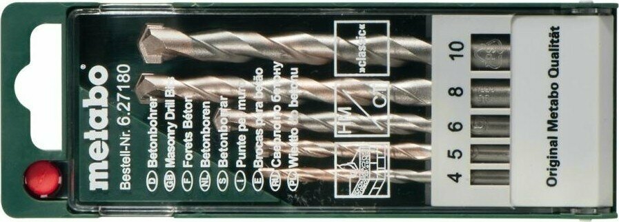 Standard sizes: for concrete 4, 5, 6, 8, 10 mm, shank type: cylindrical, quantity in the package: 5 pcs., for concrete