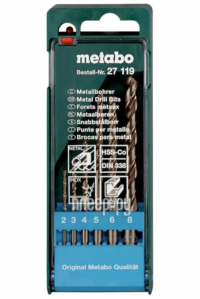 Standard sizes: for metal 2, 3, 4, 5, 6, 7, 8 mm, shank type: cylindrical, quantity per set per package: 6 pcs., drill material: HSS Co, sharpening angle: 118 degrees, for metal