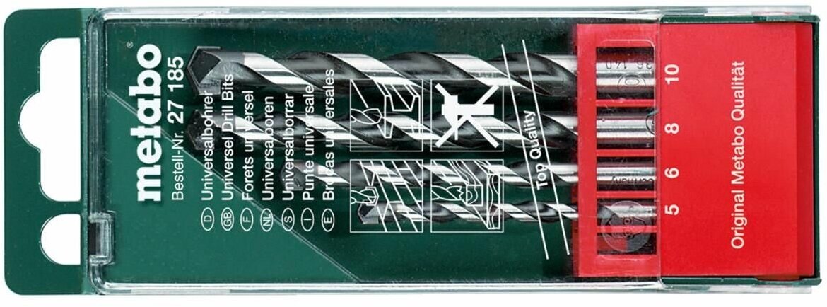 Standard sizes: universal 5, 6, 8, 10 mm, shank type: cylindrical, quantity per set per package: 4 pcs., for ceramic tiles, for stone and porcelain stoneware, for brick, for concrete, for wood, for metal