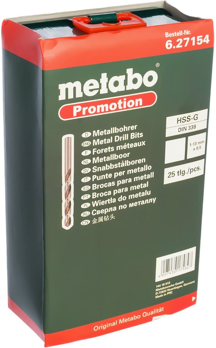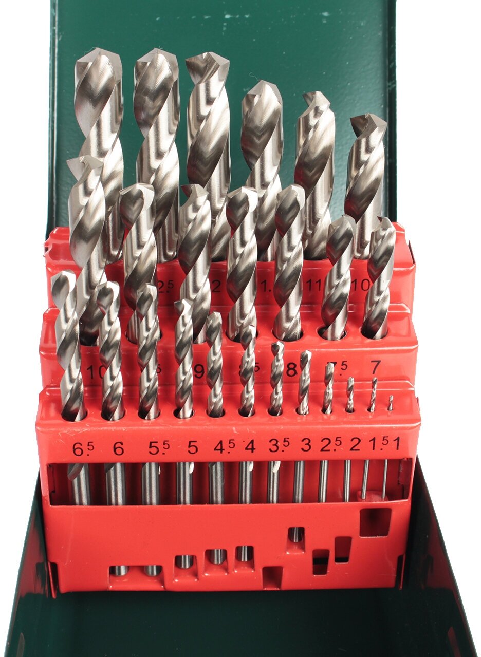 Sizes: for metal 1, 1.5, 2, 2.5, 3, 3.5, 4, 4.5, 5, 5.5, 6, 6.5, 7, 7.5, 8, 8.5, 9, 9.5, 10, 10.5, 11, 11.5, 12, 12.5, 13 mm, shank type: cylindrical, quantity in a set package: 25 pcs., drill material: HSS-G, sharpening angle: 135 degrees, for metal