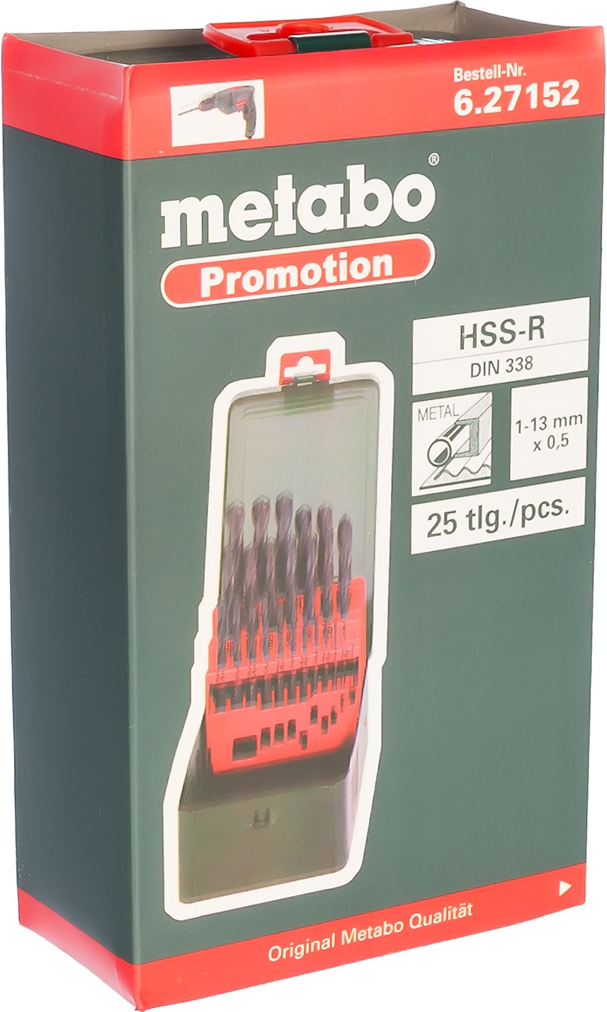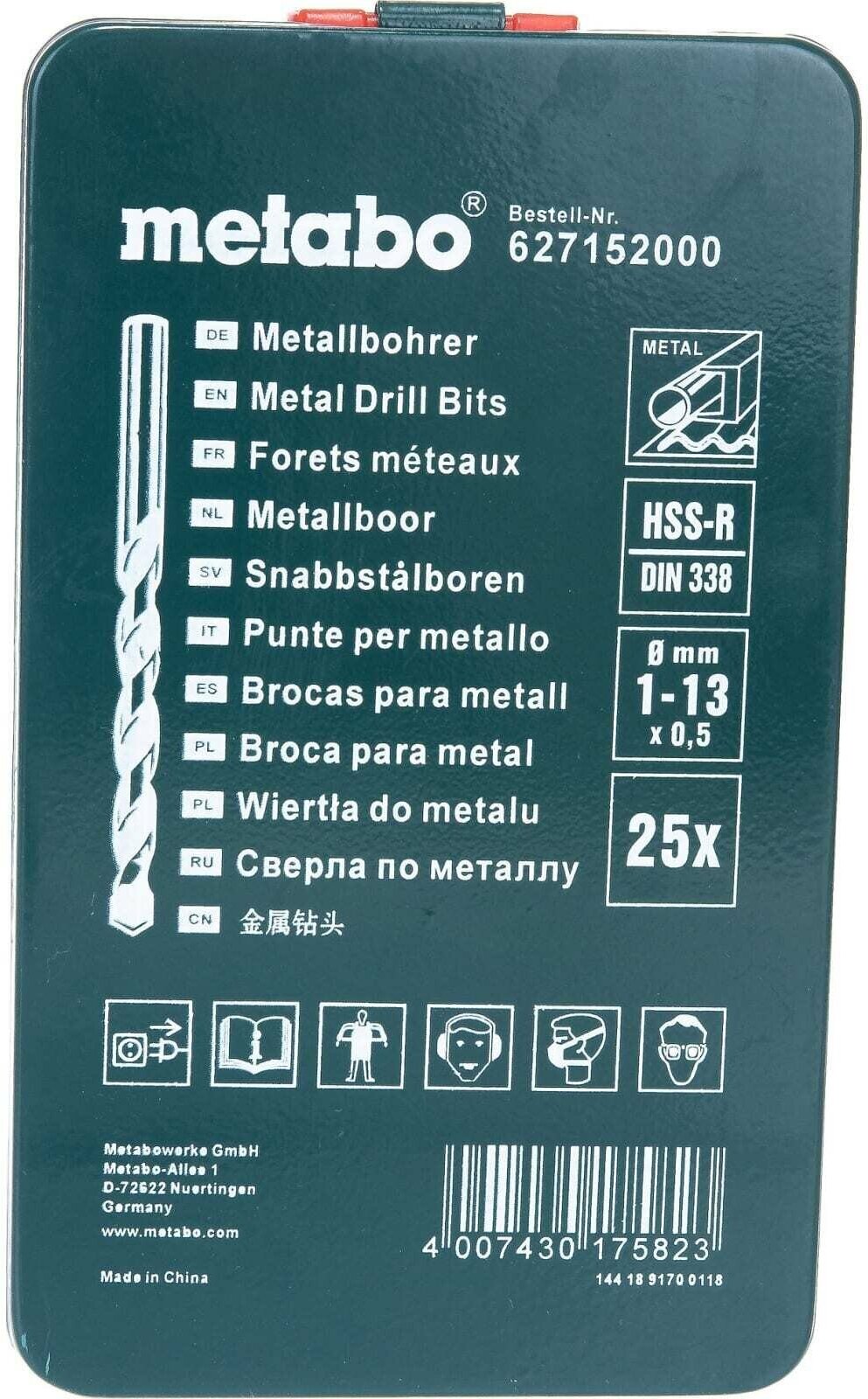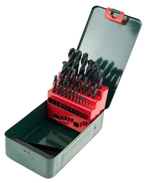 Sizes: for metal 1, 1.5, 2, 2.5, 3, 3.5, 4, 4.5, 5, 5.5, 6, 6.5, 7, 7.5, 8, 8.5, 9, 9.5, 10, 10.5, 11, 11.5, 12, 12.5, 13 mm, shank type: cylindrical, quantity per set per pack: 25 pcs., drill material: HSS-R, sharpening angle: 118 degrees, for metal
