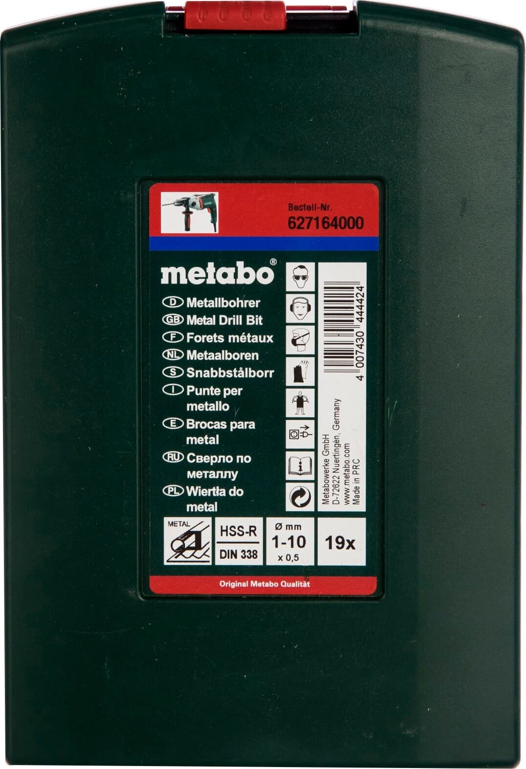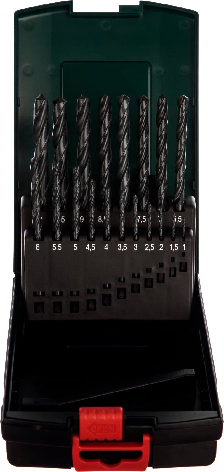 Sizes: for metal 1, 1.5, 2, 2.5, 3, 3.5, 4, 4.5, 5, 5.5, 6, 6.5, 7, 7.5, 8, 8.5, 9, 9.5, 10 mm, shank type: cylindrical, quantity in package set: 19 pcs., drill material: HSS-R, sharpening angle: 135 degrees, for metal