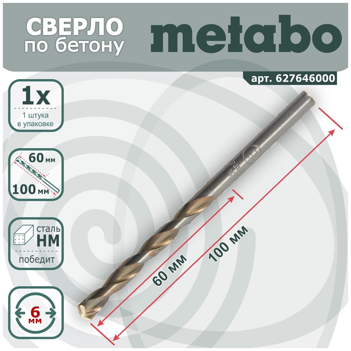 Equipment: piece, dimensions: 6x55x100 mm, shank type: cylindrical, quantity in a set package: 1 pc., for stone and porcelain stoneware, for brick, for concrete