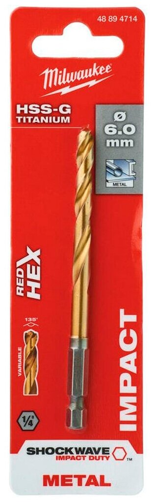 Equipment: piece, dimensions: 6x60x105 mm, shank type: hexagonal, quantity in a set package: 1 pc., drill material: HSS-G TiN, sharpening angle: 135 degrees, for metal
