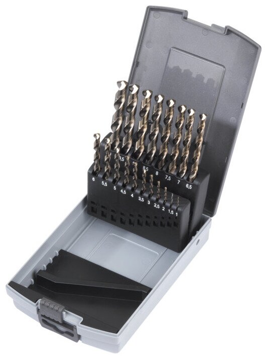 Sizes: for metal 1, 1.5, 2, 2.5, 3, 3.5, 4, 4.5, 5, 5.5, 6, 6.5, 7, 7.5, 8, 8.5, 9, 9.5, 10 mm, shank type: cylindrical, quantity in per pack: 19 pcs, drill material: HSS Co 5, for metal
