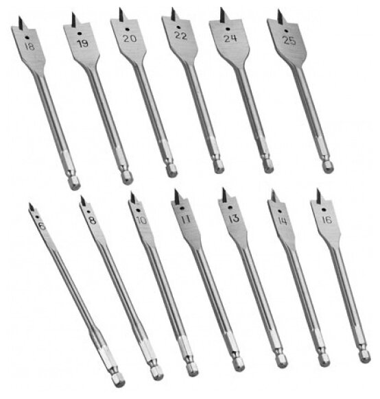 Sizes: feather for wood 6x152, 8x152, 10x152, 11x152, 13x152, 14x152, 16x152, 18x152, 19x152, 20x152, 22x152, 24x152, 25x152 mm, shank type: hex ny, quantity in a set package: 13 pcs., for wood