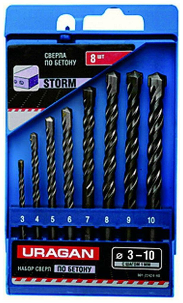 Standard sizes: for concrete 3, 4, 5, 6, 6, 8, 8, 10 mm, shank type: hexagonal, quantity in the package: 8 pcs., drill material: VK8, for stone and porcelain stoneware, for brick, for concrete