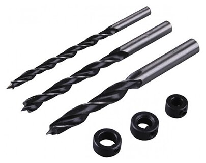 Standard sizes: for wood 6, 8, 10 mm, shank type: cylindrical, quantity in a set package: 3 pcs., drill material: HSS, for wood