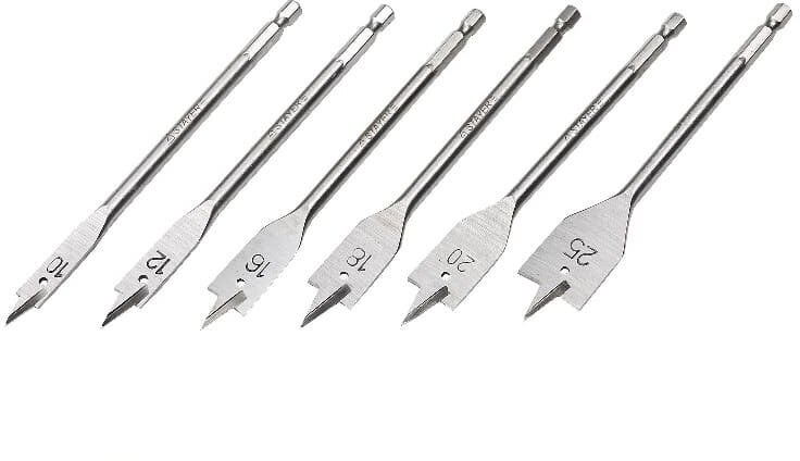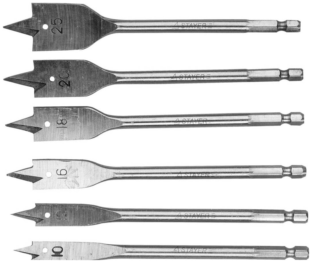 Standard sizes: feather for wood 10, 12, 16, 18, 20, 25 mm, shank type: hexagonal, quantity in a set package: 6 pcs., for wood