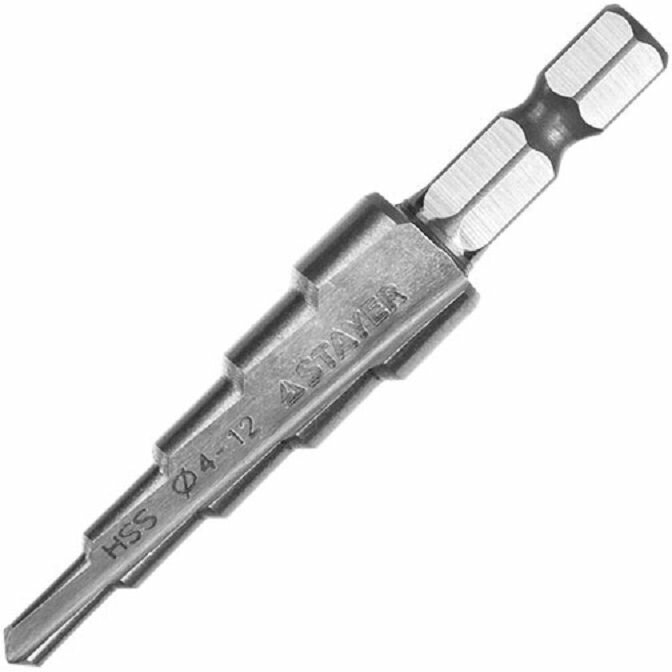Equipment: piece, standard sizes: 9 steps 4-12 mm, shank type: hexagonal, quantity in a set package: 1 pc., drill material: HSS, sharpening angle: 135 degrees, for metal