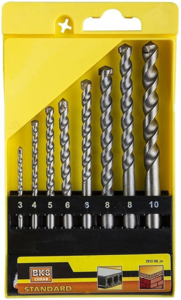 Standard sizes: for concrete 3, 4, 5, 6, 6, 8, 8, 10 mm, shank type: cylindrical, quantity in the package: 8 pcs., for stone and porcelain stoneware, for brick, for concrete