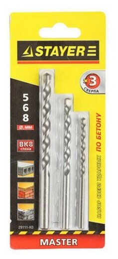 Standard sizes: for concrete 5, 6, 8 mm, shank type: cylindrical, quantity in a set package: 3 pcs., for stone and porcelain stoneware, for brick, for concrete