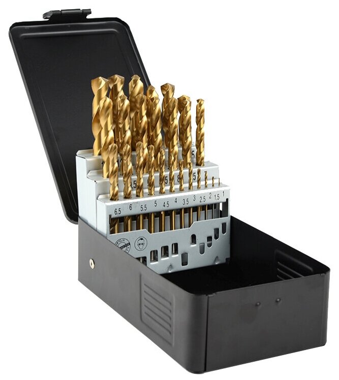 Description: Sizes: for metal: 1, 1.5, 2, 2.5, 3, 3.5, 4, 4.5, 5, 5.5, 6, 6.5, 7, 7.5, 8, 8.5, 9, 9.5, 10 mm, shank type: cylindrical, quantity in the set, package: 19 pcs., drill material: HSS-G TiN, sharpening angle: 135 degrees, for metal