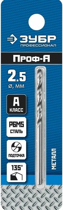 ZUBR PROF-a 2.5x57mm, Drill for metal, R6M5 steel, class A, 29625-2.5, Professional Series