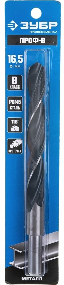 ZUBR PROF-v 16.5x184mm, Drill for metal, machined shank, R6M5 steel, class B, 29621-16.5, Professional Series