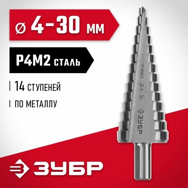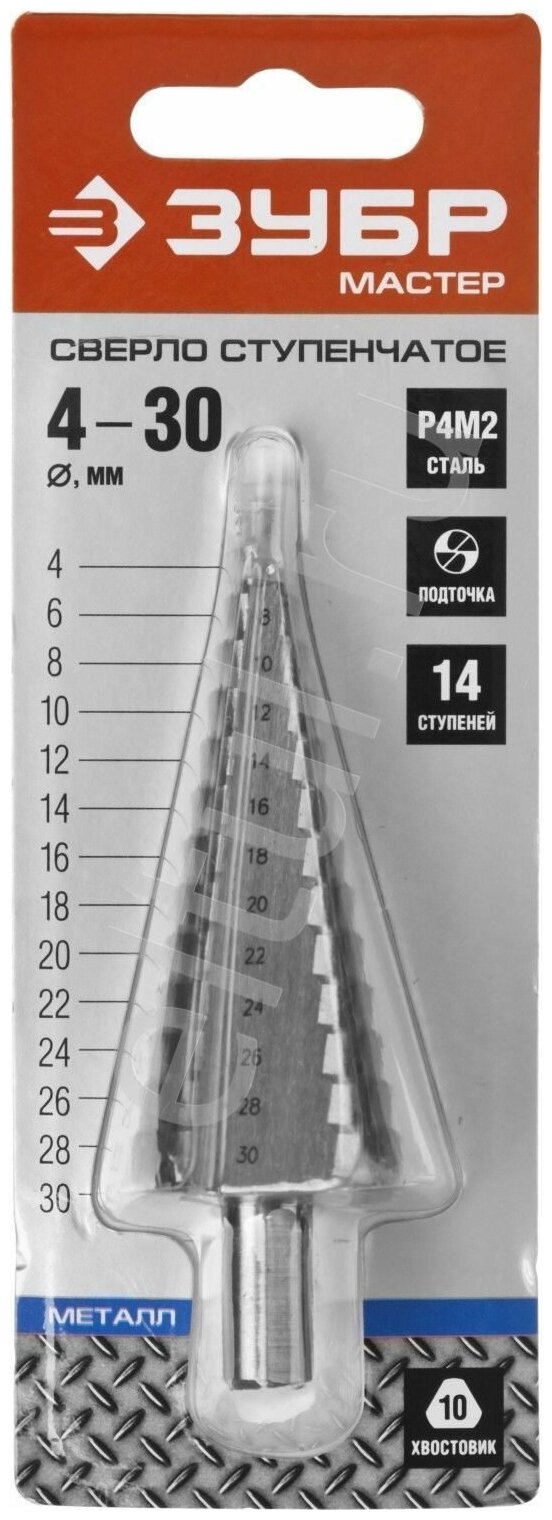 Equipment: piece, standard sizes: 14 steps 4, 6, 8, 10, 12, 14, 16, 18, 20, 22, 24, 26, 28, 30 mm, shank type: three-bearing, quantity in a set package: 1 pc. , drill material: P4M2, sharpening angle: 135 degrees, for metal