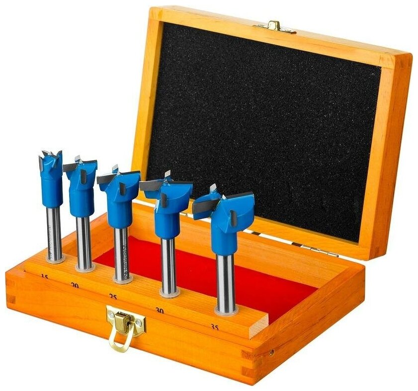 Standard sizes: Forstner for wood 15x8x90, 20x8x90, 25x8x90, 30x10x90, 35x10x90 mm, shank type: cylindrical, quantity in the package: 5 pcs., drill material: VK8, for wood