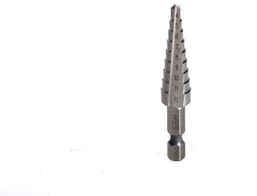 Equipment: piece, sizes: 4-12 mm, shank type: hexagonal, quantity in a set package: 1 pc., drill material: HSS, for metal